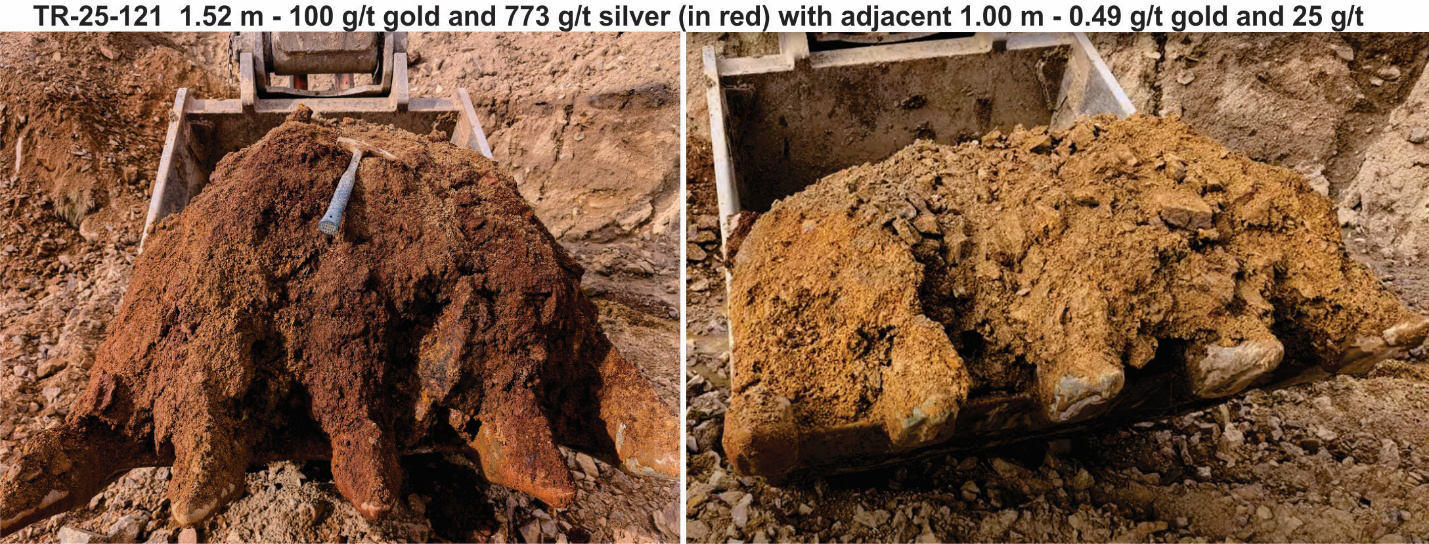 Figure 1 – Adjacent test pits (with assays) demonstrating mineralized vein vs unmineralized wall rock.