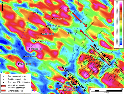 2021 Proposed drill holes at the Western BRX Extension Target with TMI