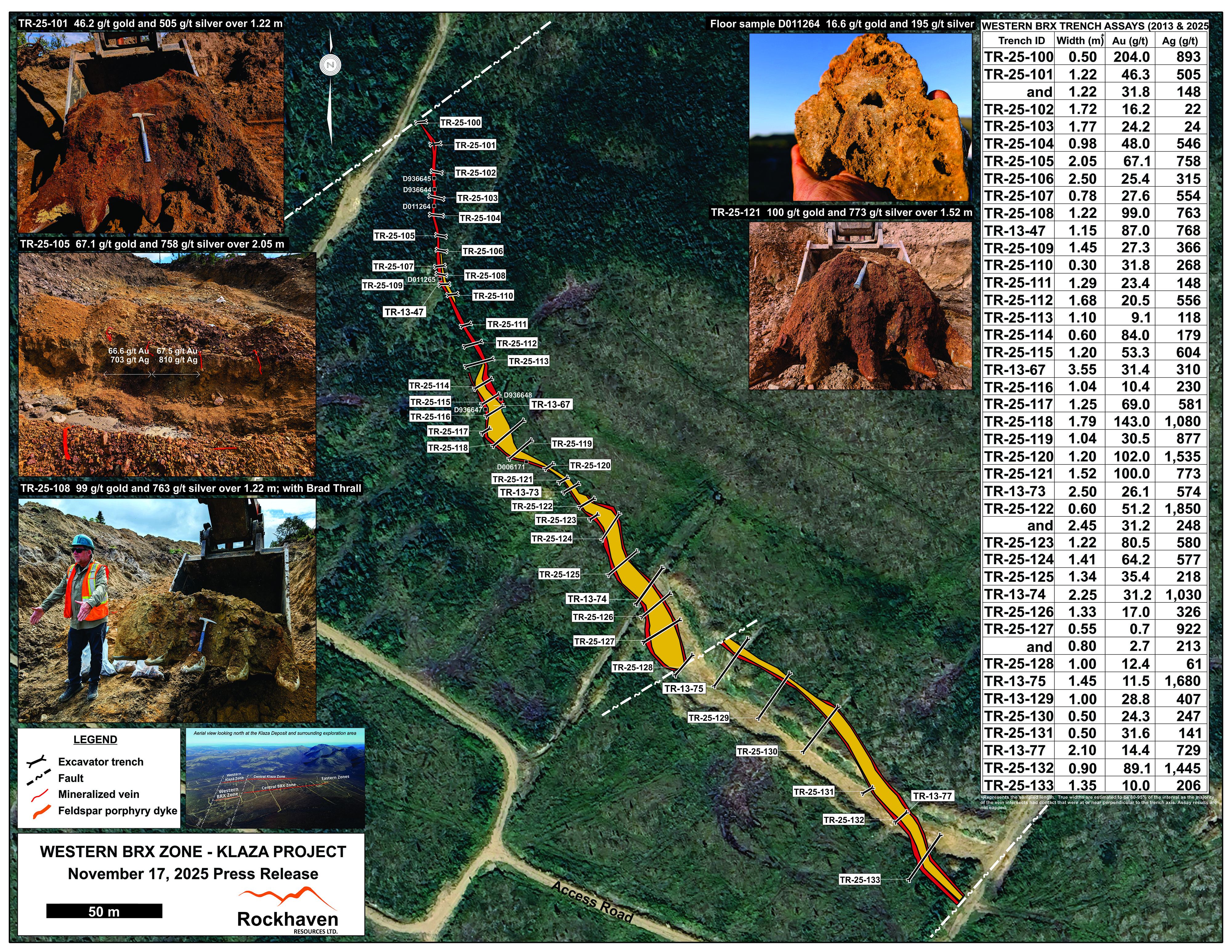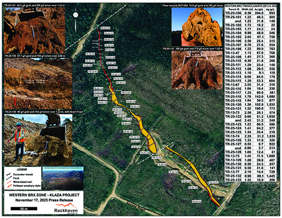 During the summer of 2025, Rockhaven conducted an excavator trenching program along the surface trace of the Western BRX Zone, one of twelve high-grade gold-silver zones discovered to date at Klaza. The purpose of this program was to: (1) determine the width, grade and character of near-surface mineralization in the zone; (2) better define structural features and controls related to the mineralization; and (3) establish the nature and depth of the oxide to sulphide transition (visually and analytically) for use in planned PFS-level metallurgical studies. To complete this evaluation, the organic overburden layer was first removed and much of the zone was stripped to bedrock. A total of 34 vein exposures were then trenched and sampled across the trace of the 460 m long zone. The information collected from this work is fundamental to the future Klaza economic studies and will assist Rockhaven’s planning for a potential bulk sampling program scheduled for summer 2026.
