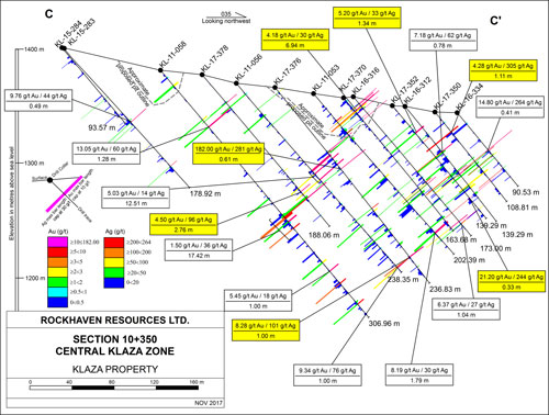 “Drilling in 2017 has successfully expanded the area of mineralization and further confirmed the exceptional continuity of high-grade gold and silver veins within the Klaza Zone,” stated Matt Turner, Rockhaven’s CEO. “We are currently revising the geological model for this zone and anticipate an updated resource estimate in early 2018.”